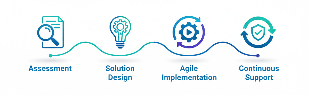 Our approach combines strategic insight, agile execution, and continuous improvement. From initial assessment to long-term support, we partner with you to deliver solutions that drive efficiency, innovation, and measurable business outcomes.